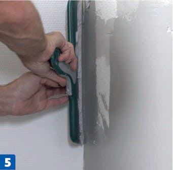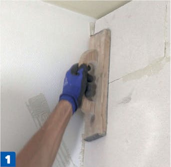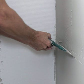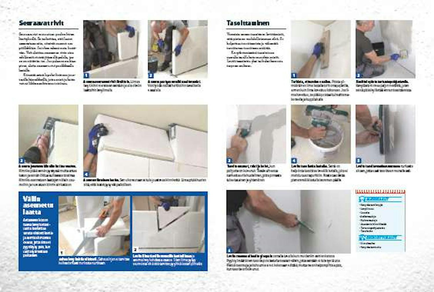 Tarkista, että seinä on sileä. Poista ylimääräinen liima lastalla tai hiomapaperilla, ennen kuin liima kovettuu kokonaan. Jos liima kovettuu, se pitää poistaa kulmahiomakoneella ja kuppilaikalla.