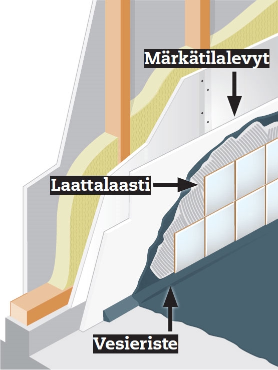 Laatat ja saumat tarkistetaan päivittäin kosteusja vesivaurioiden varalta. Tehokkain suoja vettä ja kosteutta vastaan, ja tämän myötä myös lahoa ja hometta vastaan, sijaitsee kuitenkin laattojen alla. Kylpyhuonetta rakennettaessa märkätilamääräyksiä pitää noudattaa tunnollisesti. Ohessa oikeaoppinen märkätilan seinärakenne.
