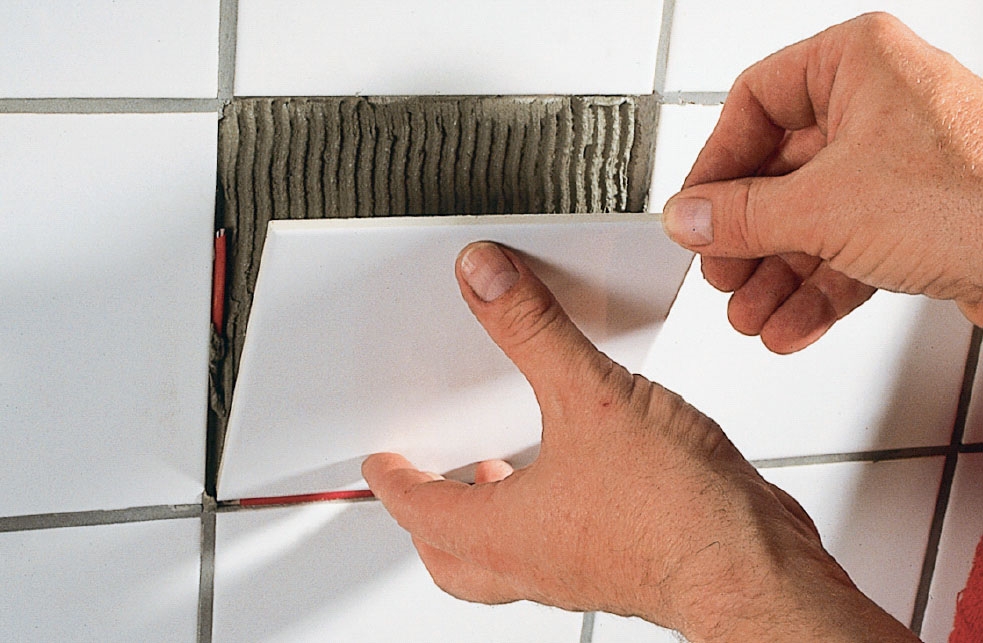 Jos laatassa on reikä tai halkeama, se pitää vaihtaa, jotta sen taakse ei pääse vettä. Poista ensin vanha saumalaasti ja naputtele sitten laatta varovasti irti. Poista kiinnityslaasti. Levitä tilalle uutta laastia ja aseta uusi laatta paikoilleen. Tue se kiiloilla joka puolelta. Saumaa seuraavana päivänä.