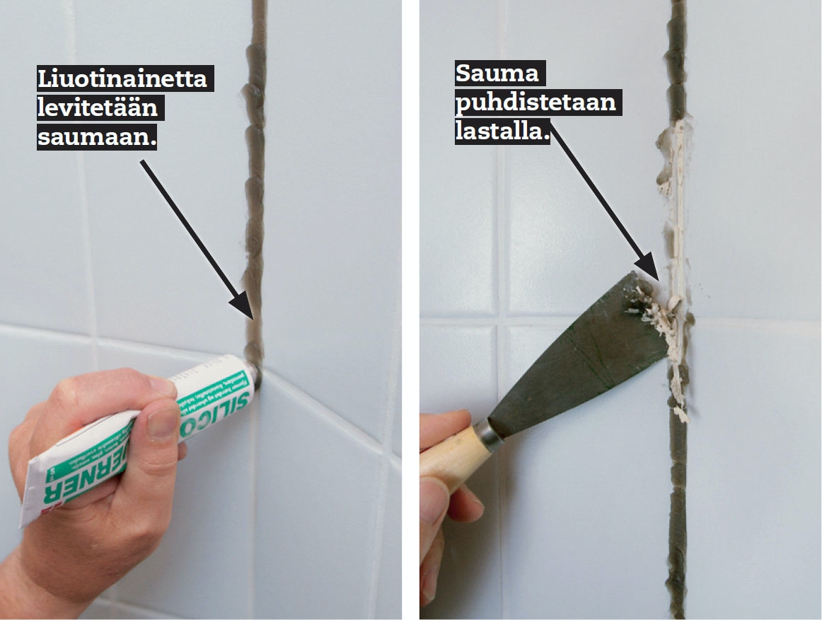 Silikonisaumat, jotka ovat kovin tummuneet, pitää vaihtaa. Vanha silikoni poistetaan kokonaan, muussa tapauksessa uusi saumamassa ei kiinnity. Vanhan saumamassan voi poistaa taittoteräveitsellä, kunhan ei vaurioita alla olevaa vesieristystä. Voit myös liottaa sauman silikoniliuotusaineella ja kaapia massan pois teräslastan avulla. Puhdista sauma etikkaan kostutetulla liinalla ja anna sauman kuviua seuraavaan päivään. Silikonisaumaa.