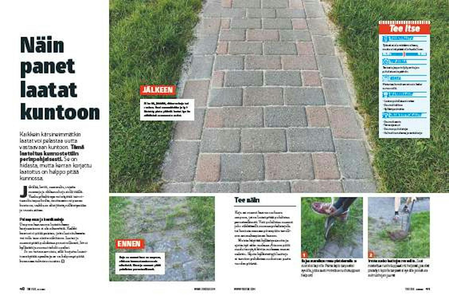 Irrota ruoho laattojen reunoilta. Saat nosteltua ruohotuppaat irti helposti, jos olet pistellyt lapiolla tarpeeksi syvälle ja katkaissut ruohojen juuret.