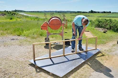 Sekoita betoni. Se on helpoin tehdä (vuokratussa) betoni-sekoit ti messa. Käy täm-me kuitubetonia, jo ka on vahvinta betonilaatua.