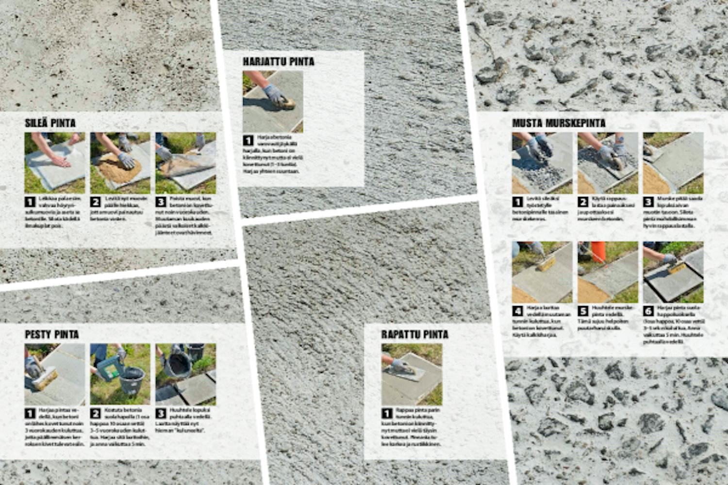 Rakennamme ison valu-muotin, jossa voi luoda viisi eri betonipintaa. Jos haluat valaa laattoja esim. pihapolkua varten, voit valaa ne paikan päällä. Tarvitset vain yhden laatan kokoisen valumuotin, jota käytetään kaikkiin laattoihin, ja jota siirretään, kun betoni on saanut kovettua 2-3 päivää. Tai jos haluat laatoittaa suu-remman alueen, voit valaa osaan laatoista hieman eri-koisemman pintakuvion. Nämä laatat on valettu kuitubetonista. Voit käyt-tää myös tavallista beto-nia. Se ei ole yhtä vahvaa, mutta maksaa vain puolet kuitubetonin hinnasta.