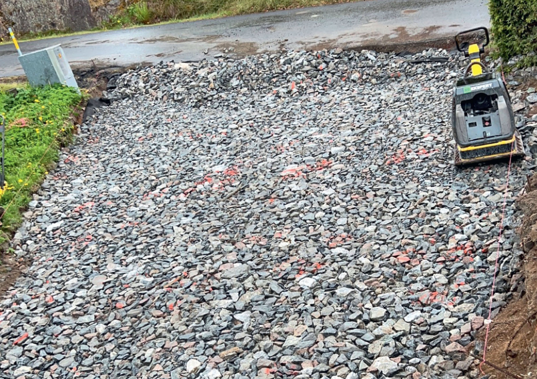 Levitä jakava murske kuopan pohjalle. Tässä vaiheessa ei tarvitse olla niin tarkkana kuin kantavan murskeen kanssa. Tiivistä jakava murske tärylevyllä. 35 sentin kerros painuu noin 10 senttiä.