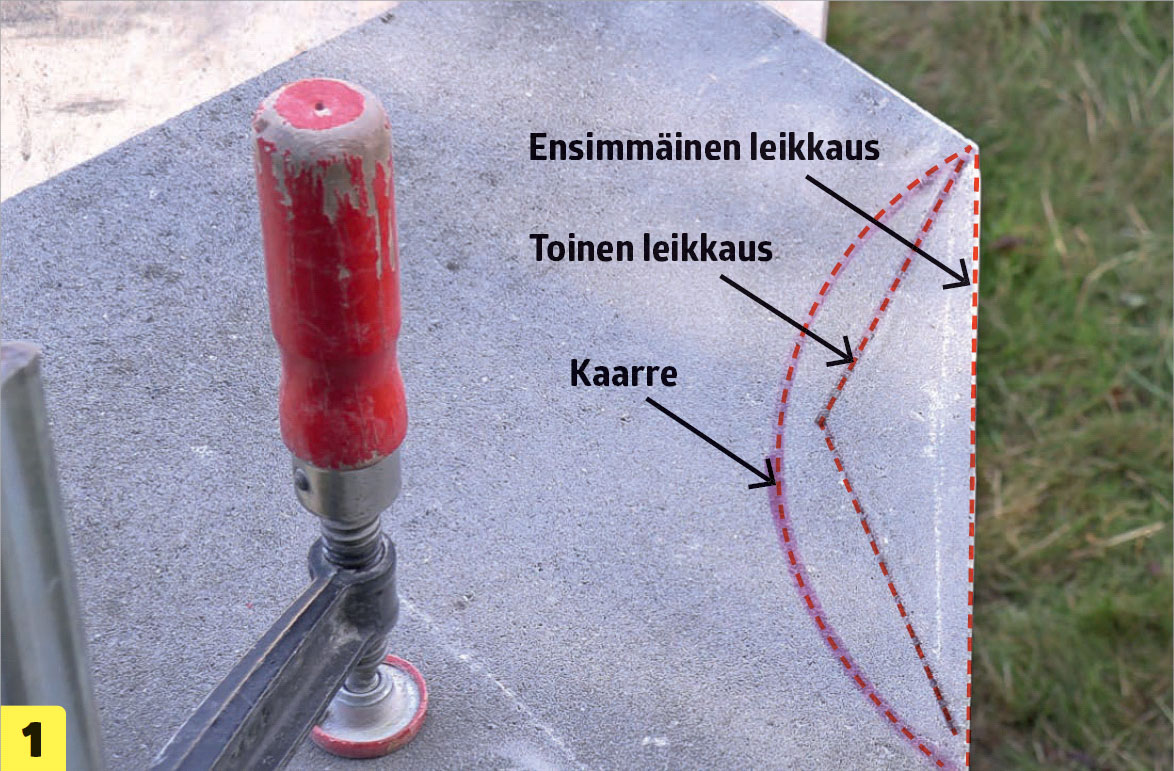 Tee reunalta pieniä viiltoja vieri viereen kaarteen reunaan asti. Leikkaa sitä ennen laatan pinta rikki kaarteen ääriviivaa pitkin.