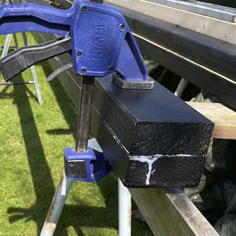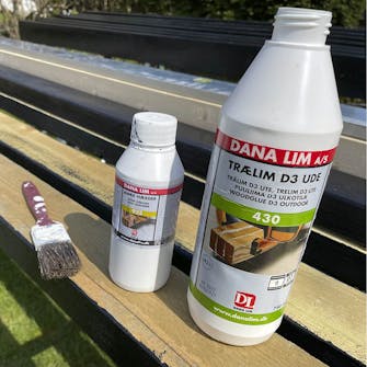 Levitä tarpeeksi säänkestävää puuliimaa molemmille maalaamattomille pinnoille. Liimaa pitää olla niin paljon, että se pursuaa ulos lankkujen välistä, kun ne puristetaan yhteen.