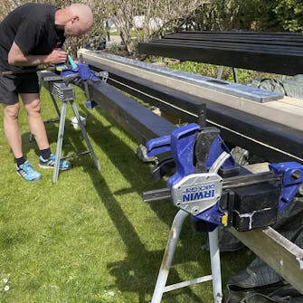 Pane lankut kahden tukevan pukin päälle ja ota esiin liima, kovetin ja pensseli. Työ sujuu paljon helpommin, kun lankut ovat hyvällä työskentelykorkeudella ja niihin pääsee käsiksi molemmilta puolilta.