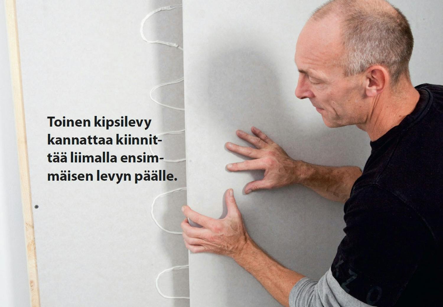 Yleensä kipsilevyjen kiinnitykseen tarvitaan suuri määrä ruuveja ja pal-jon tasoitetyötä. Jos levyt asennetaan suoraan olemassa olevaan sei-nään tai toiselle levypinnalle, voit käyttää liimaa, ja jos kipsilevyt asennetaan puu- tai teräsrunkoon, asennusliiman käytöllä voidaan vähentää ruuvien tarvetta merkittävästi.