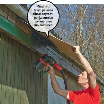 Aidat ja ulkoseinät voi maalata käyttämällä suojana levynpalasta. Sitä on helppo siirtää sitä mukaa, kun työ etenee. Levy suojaa kiveystä maaliroiskeilta ja estää sen, että maaliruiskun ilma puhaltaa maasta hiekkaa, lehtiä ja muuta roskaa maalin sekaan.