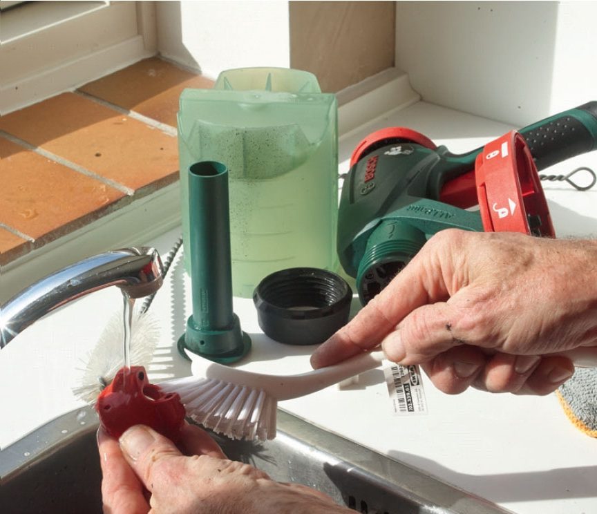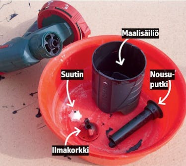 Nykyaikainen maaliruisku on helppo purkaa osiin. Ruuvaa suuttimen ympärillä oleva liitin irti ja nosta ilmakorkki ja suutin pois. Ruuvaa säiliö irti ja vedä nousuputki pois. Muuta ei tarvita.
