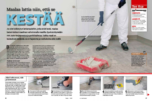 Lattia ja reunus maalataan yhtä aikaa, jotta reunuksen maali ei ehdi kuivua en-nen kuin lattia on maalattu. 20°:n lämpö-tilassa maalin pinta kuivuu parissa tun-nissa. Lopullinen lujuus saavutetaan muutaman vuorokauden päästä.