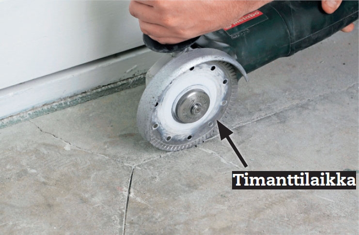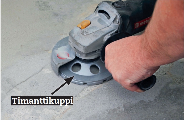 Hio lattiassa olevia kohoumia, kunnes lattia on aivan tasainen. Käytä kulma-hiomakoneessa timanttikuppia. Vähennä ko-neen nopeutta, niin sitä on helpompi ohjata.