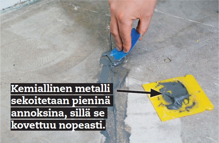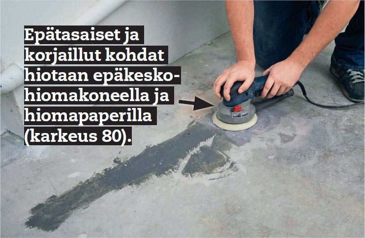 Lattia pitää puhdistaa ennen maalaamista. Jos siinä on halkeamia, kohoumia tai pieniä reikiä, ne pitää korjata. Pienet halkeamat ja reiät voi paikata kemialli-sella metallitasoitteella. Sitä voi levittää hyvin ohuen kerroksen ilman, että se lohkeilee - toisin kuin sementtipohjai-nen saneerauslaasti, jota tarvitaan, jos lattiassa on isompia reikiä.