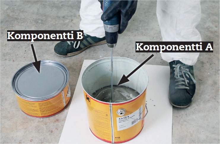 Ennen kuin yhdistät komponentit, sekoita hartsipitoinen maali (komponentti A) hyvin. Käytä porakoneeseen kiinnitettävää sekoitusvispilää, pyöritä hitaalla nopeudella.