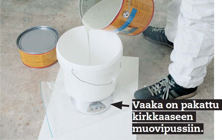 Aseta puhdas maaliastia vaa'alle, ja nollaa vaa’an asteikko. Kaada sekoi-tusastiaan haluttu määrä komponenttia A. Tässä tapauksessa määrä oli puolet (2,1 kg).