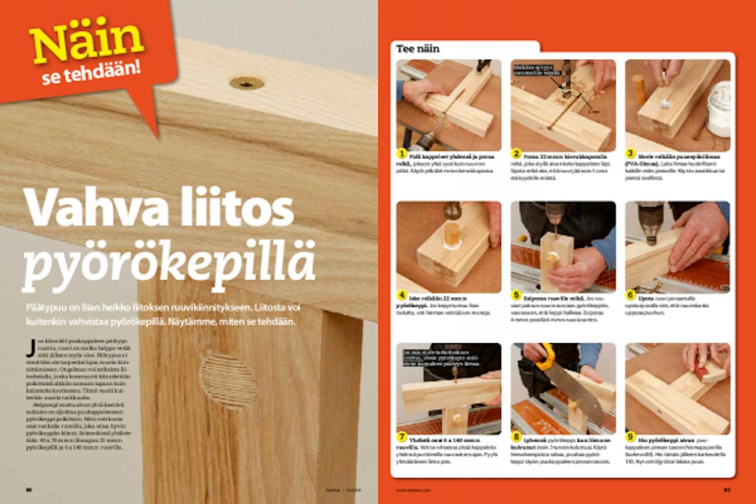 Poraa 22 mm:n kierukkaporalla reikä, joka ei yllä aivan koko kappaleen läpi. Sijoita reikä niin, että ruuvi jää noin 1 cm:n etäisyydelle reiästä.