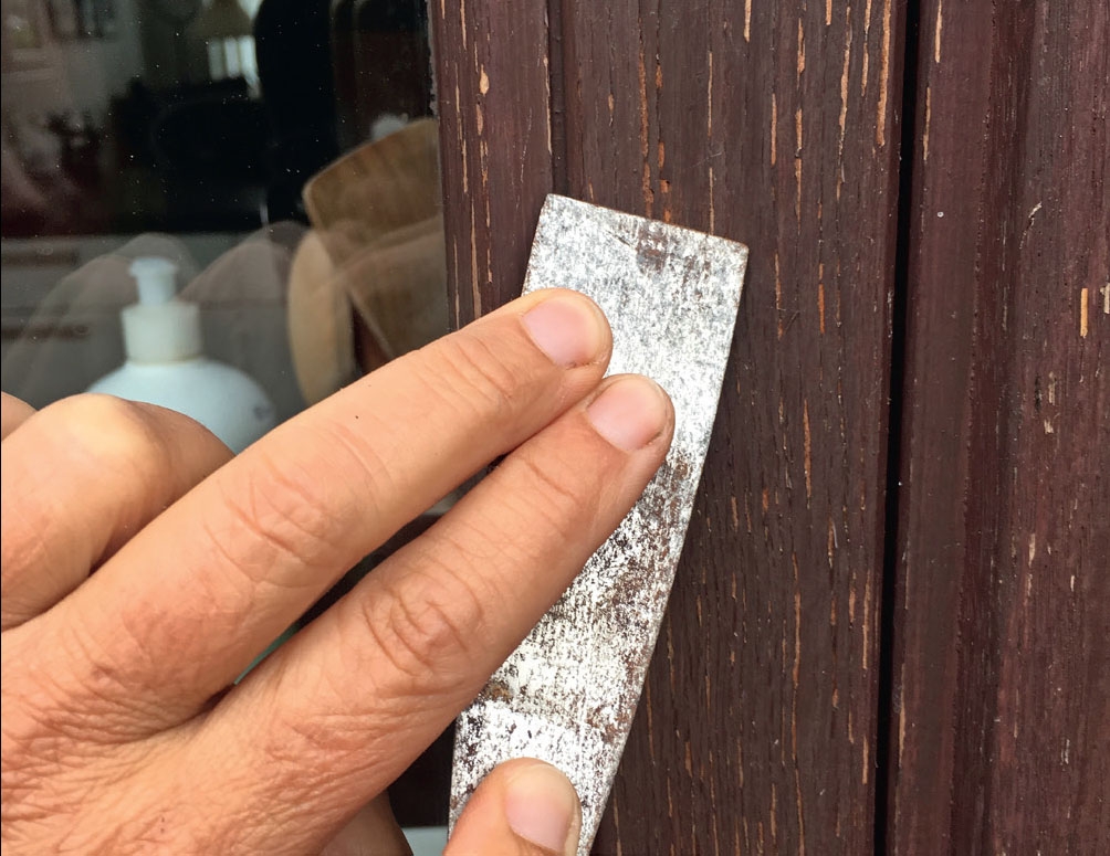 Kaavi irtomaali pois lastalla, teräsharjalla tai kaapimella. Tarkista myös, ettei puusta törrötä ylimääräisiä ruuveja tai nauloja.