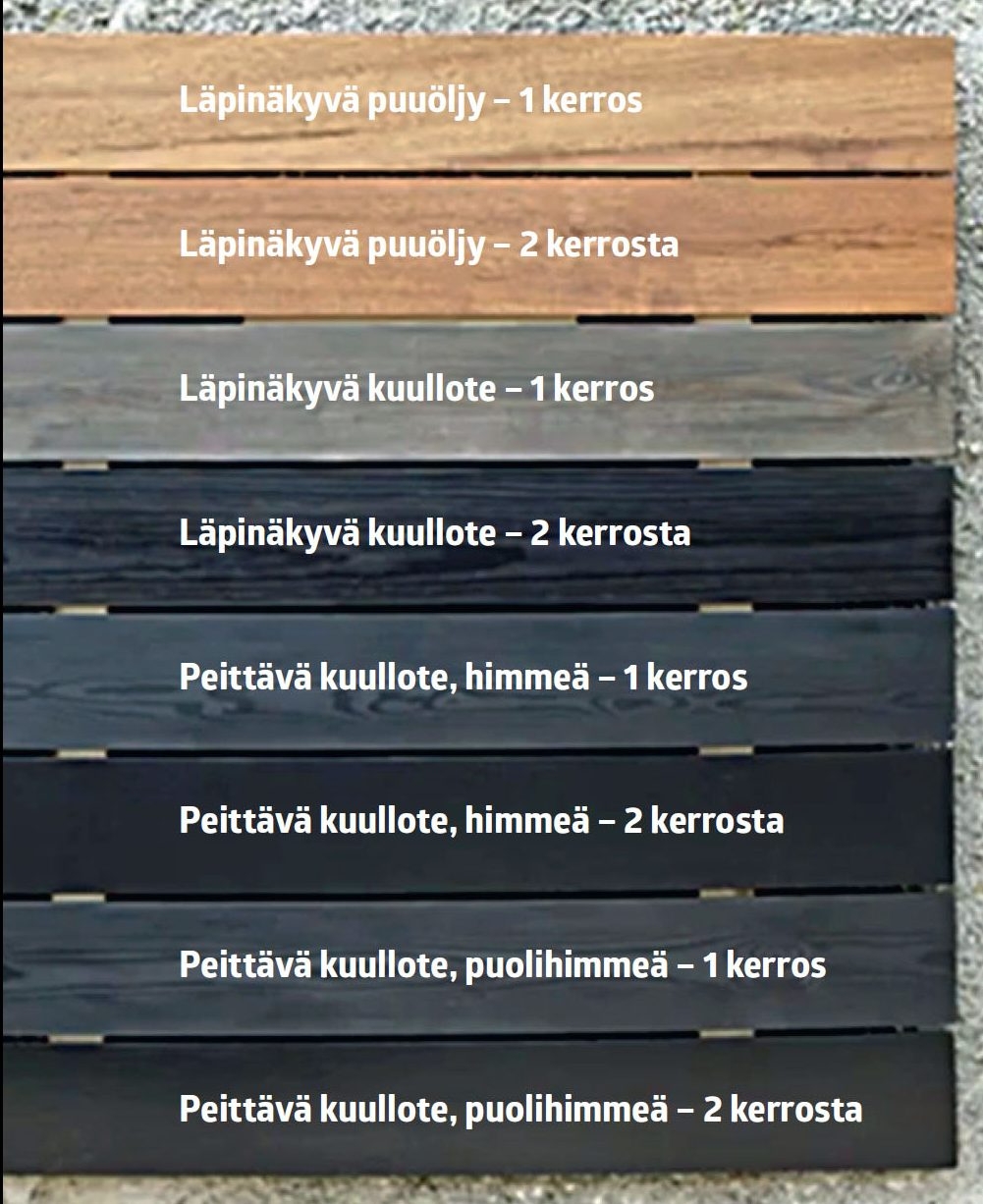 Läpinäkyvä kuullote tai puuöljy, johon on lisätty väriaineita ja sieniä torjuvia fungisideja. Läpinäkyvä kuullote korostaa puuta ja suojaa sitä lahoamiselta. Sekä öljyä että läpinäkyvää kuullotetta on helppo levittää, mistä on hyötyä isoilla pinnoilla. Laudat voi suojata myös maalilla tai peittävällä kuullotteella, mutta niiden levittäminen on vaikeampaa.