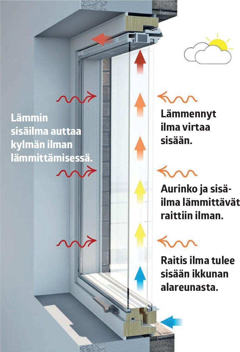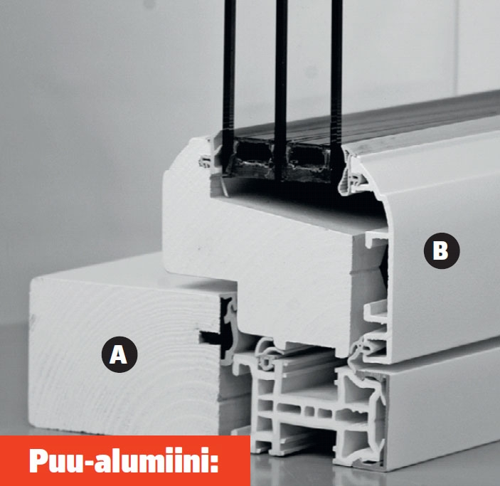 Puu-alumiini-ikkunoissa on perin-teiset puupuitteet, mutta niiden ulkopinnat on suojattu alumiini-listoilla. Ikkunan sisäpuoli näyttää perinteiseltä puu ikkunalta A, mutta ulkopuolta B ei tarvitse huoltaa maalaamalla. Aiemmin rakenteessa oli se huono puoli, että alumiini johti sisälle kylmyyttä, mutta ikkunateh-taat ovat kyenneet ratkaisemaan ongelman niin hyvin, että alumiinilla suojatut ikkunat johtavat lämpöä yhtä huonosti kuin puuikkunat.