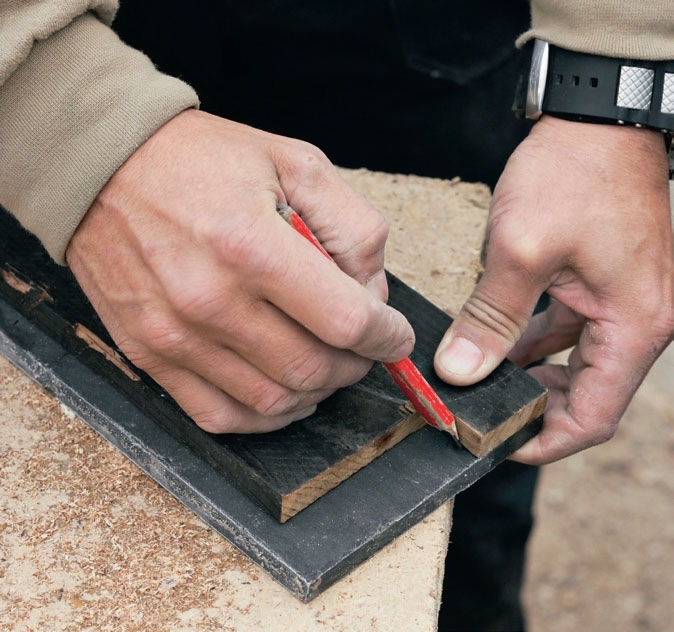 Valmiista ikkunapenkistä tehdään ensin malli, jota käytetään merkintöjen siirtämiseen liuskelevyille. Vaikka ikku-napenkit eivät ole täsmälleen saman pituisia, mallia voi käyttää useimpien katkaisulinjojen merkitsemiseen.