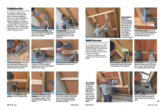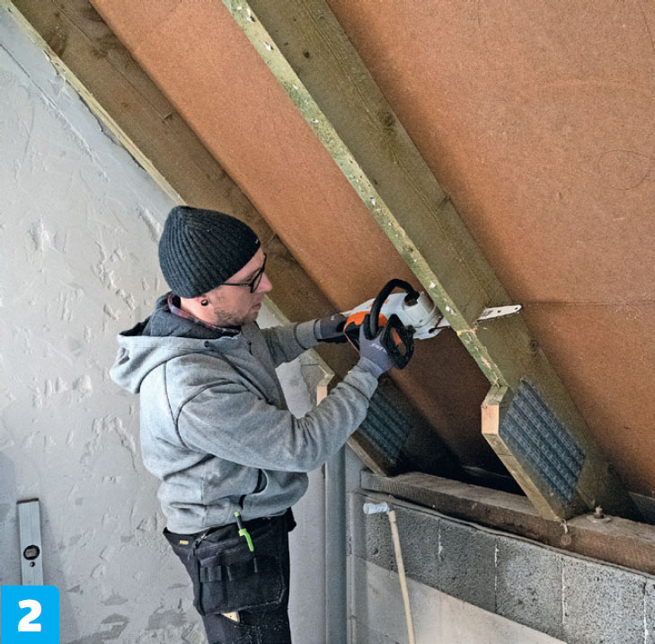Sahaa kaksi lankunpätkää. Niiden pitää sopia tarkasti ehjien kattopalkkien väliin. Myös tässä vaiheessa on tärkeää sahata lankkujen päät suorassa kulmassa.