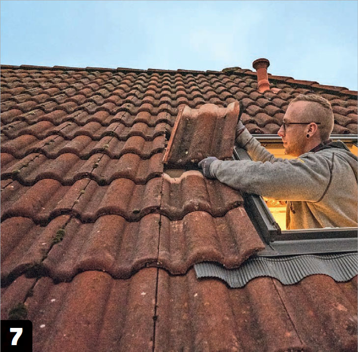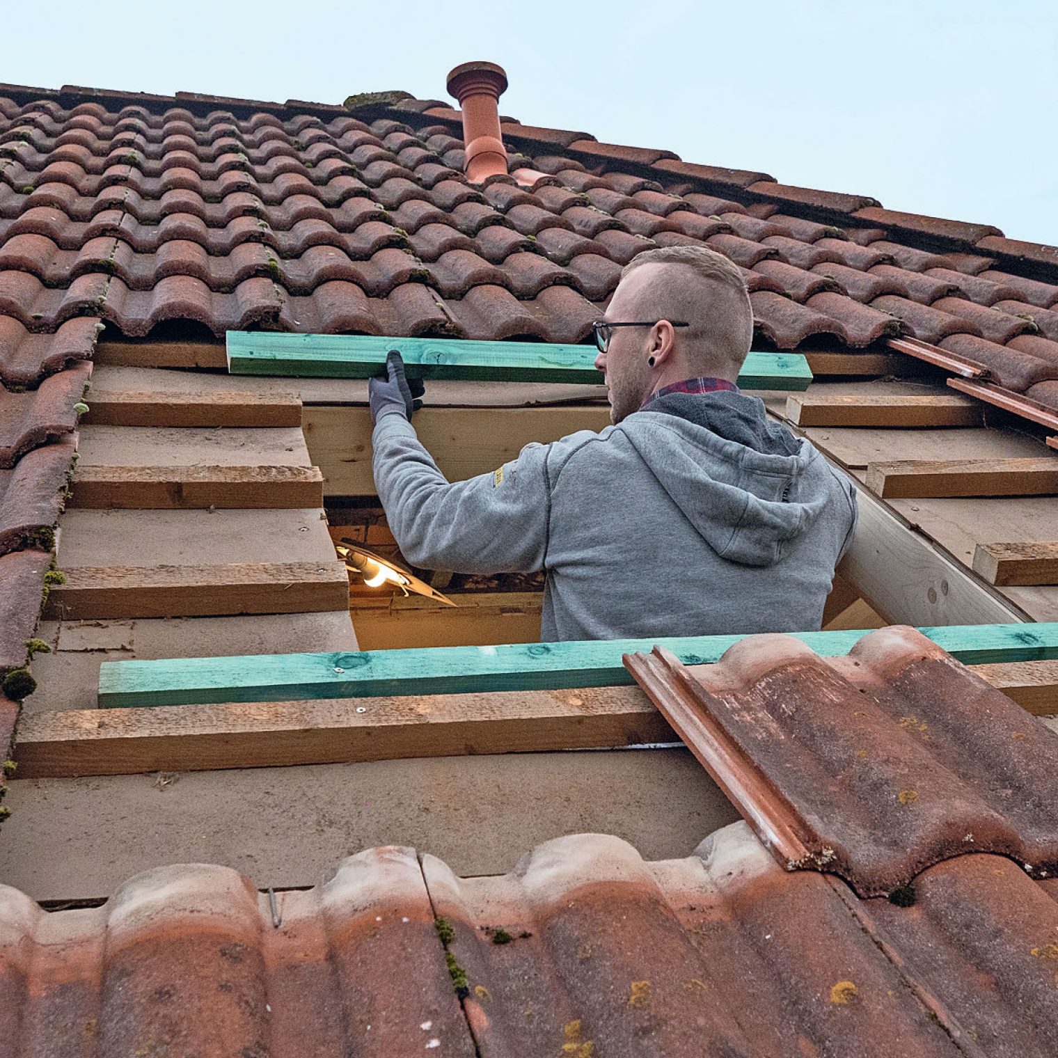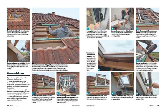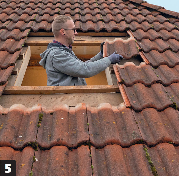 On aika tehdä reikä vesikattoon. Aluksi sahataan reikä aluskatteeseen, joka on tehty HDF-levyistä. Kun reikä on tehty, kattotiilet nostellaan pois ikkunan kohdalta. Sen jälkeen sahataan poikki ruoteet aukon kohdalta.