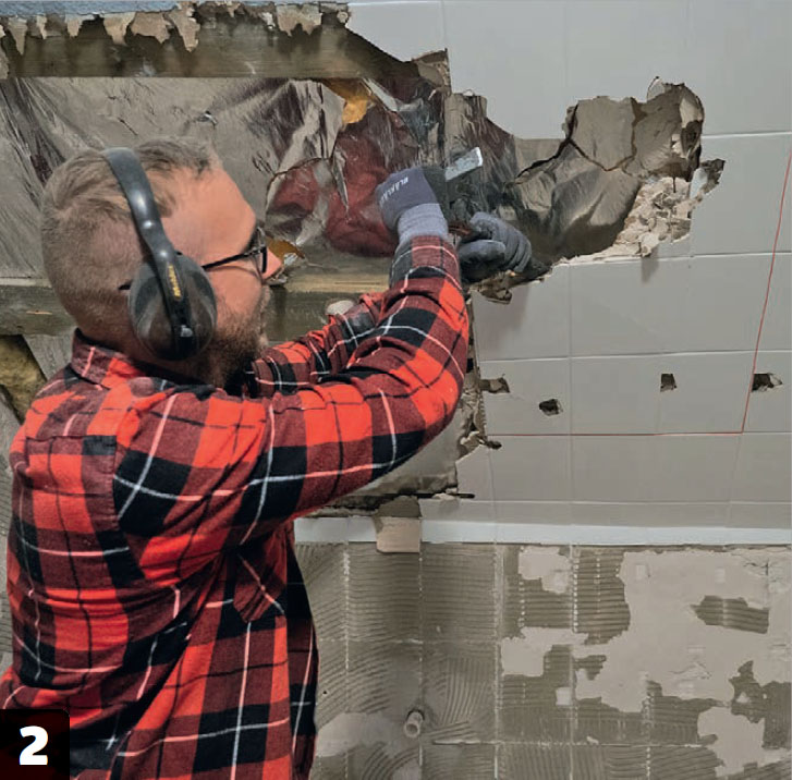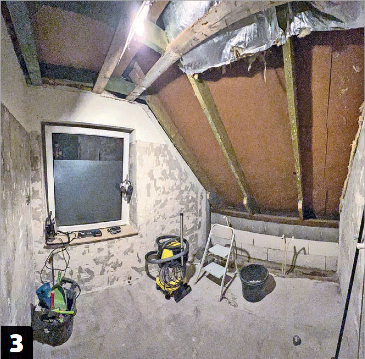 Jos ikkuna tulee käytössä olevaan huoneeseen kuten tässä, joudut purkaman pois kaikki pintamateriaalit kuten levyt, laatat, listat, paneelit ja höyrynsulkumuovin. Vasta sen jälkeen pääset aloittamaan kattoikkunan asennuksen.