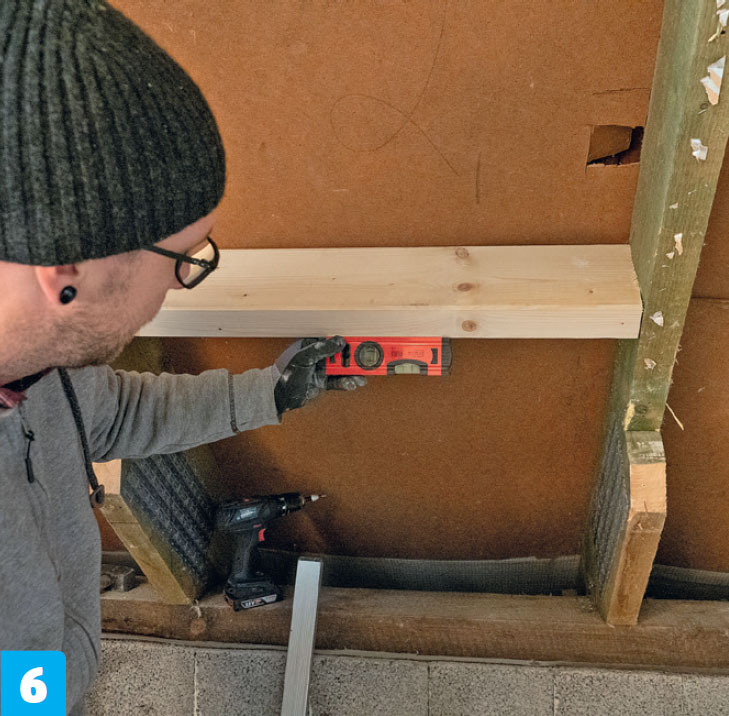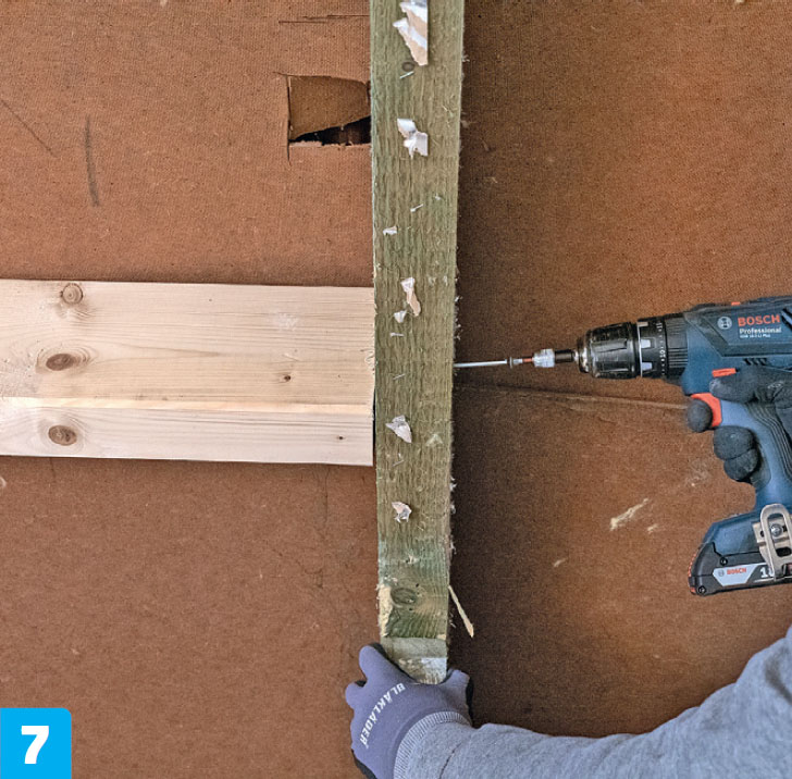 Ruuvaa uusi lankku kiinni viereisiin palkkeihin. Asenna kaksi 6x120 millin ruuvia kumpaankin päähän. Tarkista, että poikkilankut ovat edelleen vaakasuorassa.