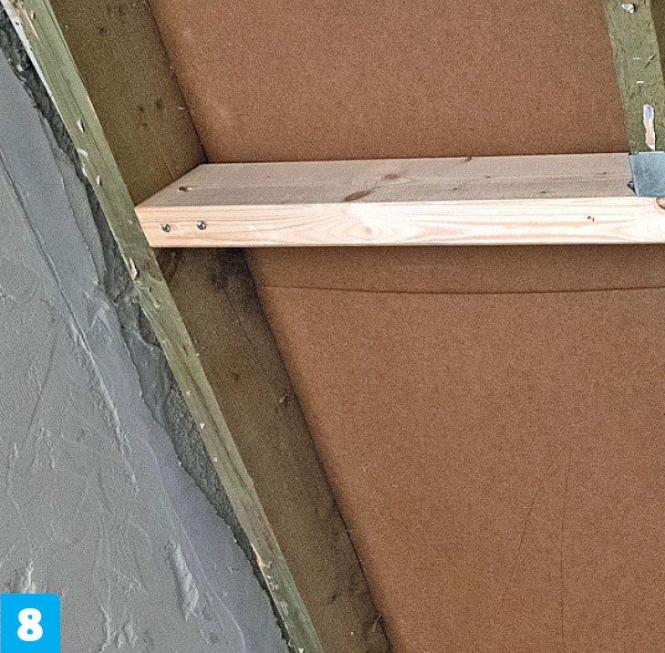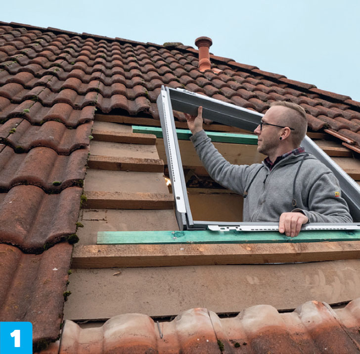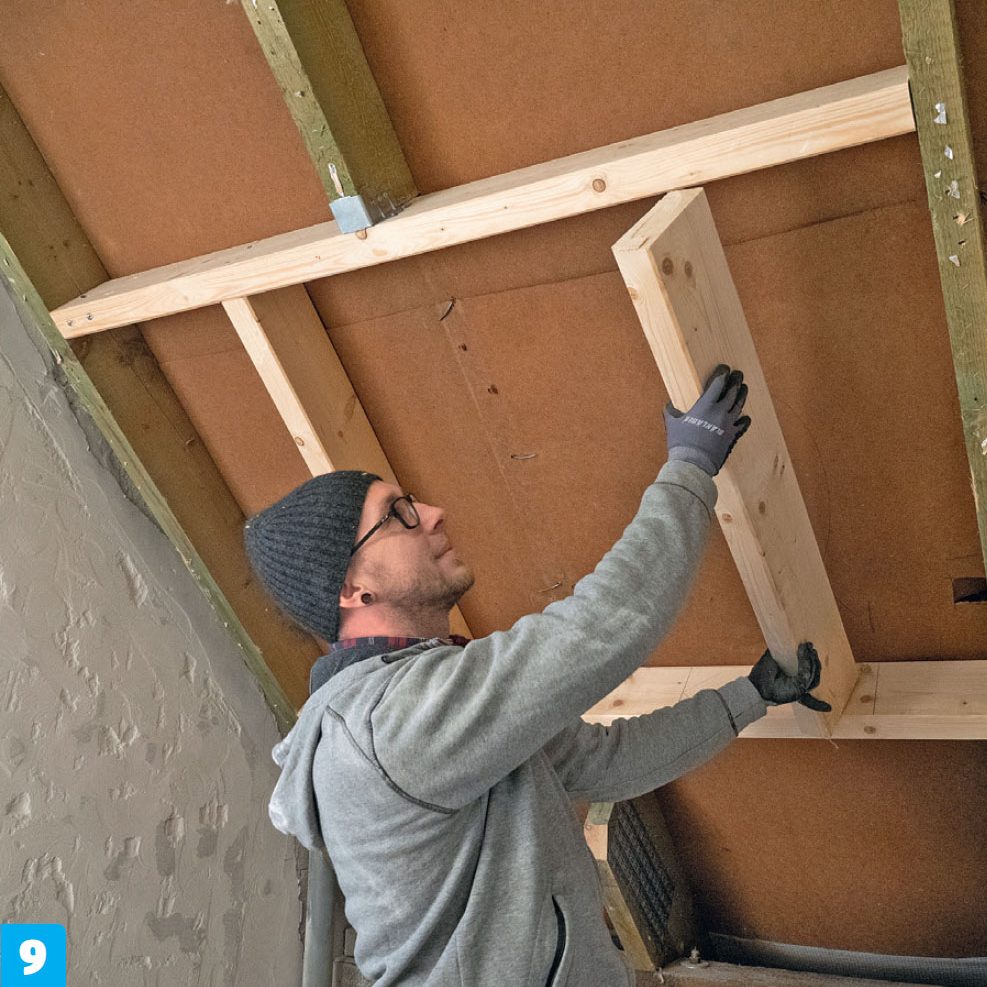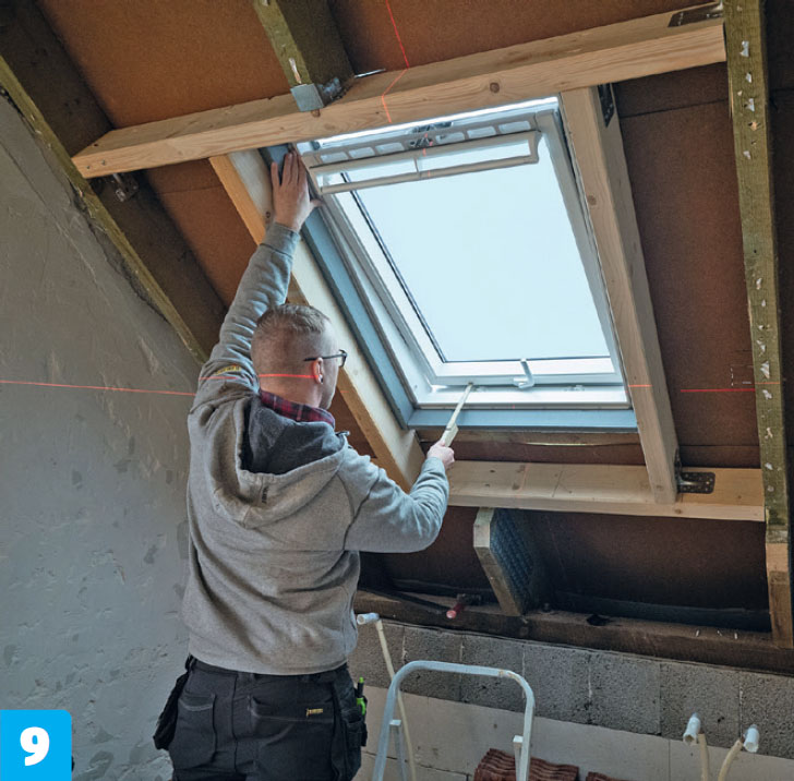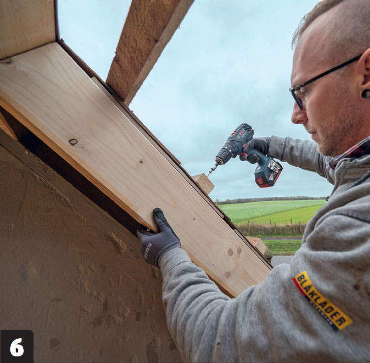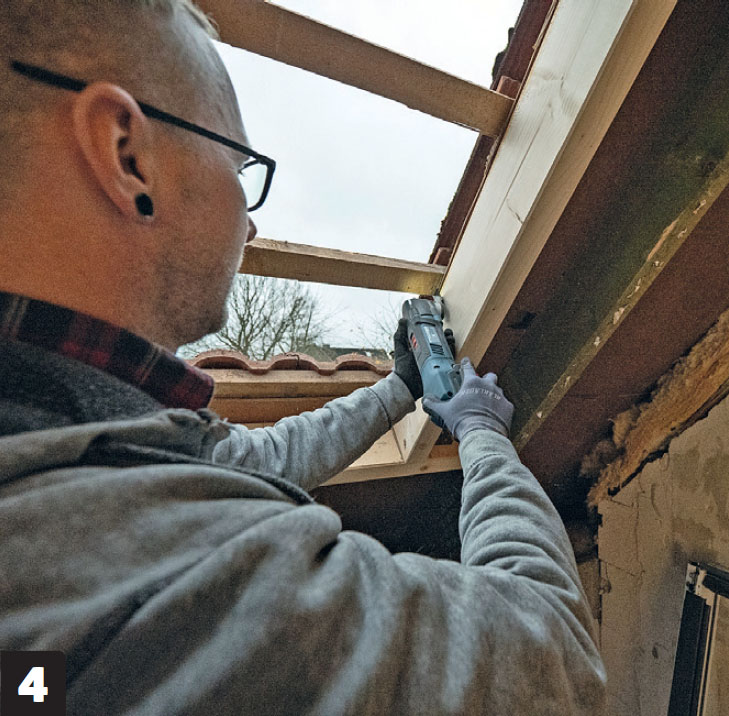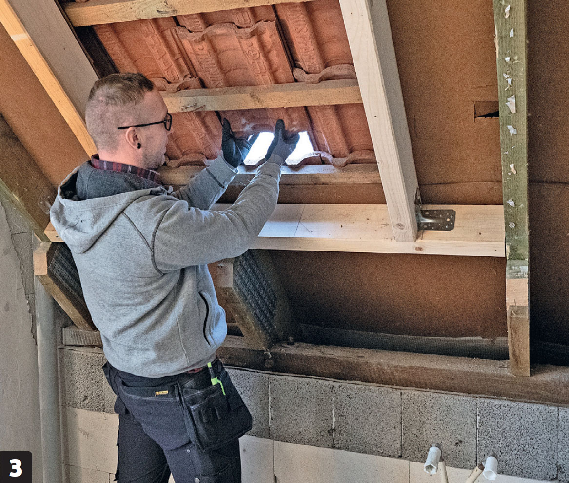 Kiinnitä poikkilankut poikki sahatun kattopalkin päihin ja viereisiin kattopalkkeihin. Tee lopuksi poikki lankkujen väliin kehikko, jossa on tilaa ikkunalle sekä 4-6 milliä asennusvaraa.