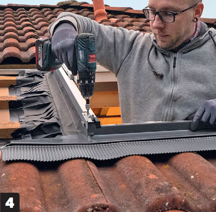 Niittaa tiiviste kiinni aluskatteeseen. Tiivisteen joustava osa taitellaan ruoteiden ympärille ja kiinnitetään aluskatteeseen niiteillä. Sen jälkeen se teipataan kiinni reunoihin.
