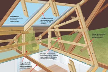 Asenna pienet kipsilevynpalat pystyyn ja tee kolot vanhojen ristikoiden ympärille. Ne hiotaan ja maalataan myöhemmin. Tee levyistä niin isot, että ne yltävät 5–10 senttiä katon alapuolelle.