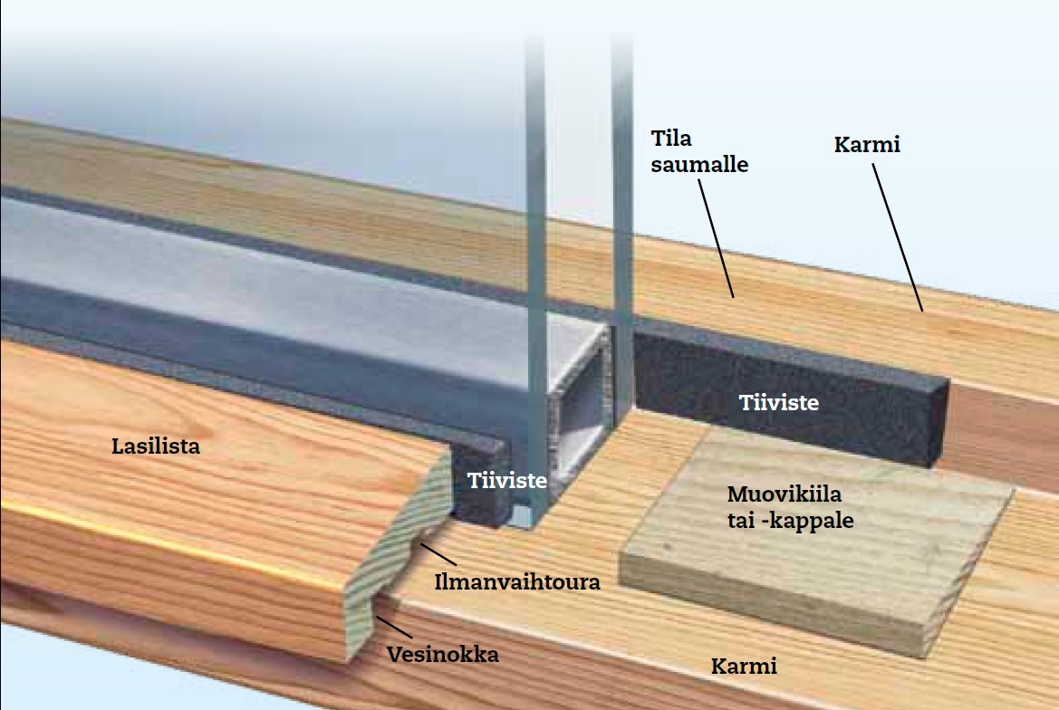Kun vanha lasi on poistettu, karmit tulee puhdistaa huolellisesti kauttaaltaan ja puuosat käsitellä puunsuojaöljyllä. Aseta uusi lasi tasaiselle alustalle muovikappaleiden tai -kiilojen päälle, jotta lasin ja karmin väliin jää rako. Lasin sisä- ja ulkopuolelle tulee kiinnittää itsekiinnittyvä tiivistenauha. Toiselta puolella se kiinnitetään lasilistaan ja toiselta puolelta karmiin. Sisäpuolen tiiviste asetetaan hieman karmin reunan alapuolelle, jotta sen päälle voidaan levittää saumausainetta. Lasilistassa tulee olla ilmanvaihtoura, joka estää kosteutta pääsemästä sisään. Listassa tulee myös olla vesinokka, josta sadevesi valuu pois.