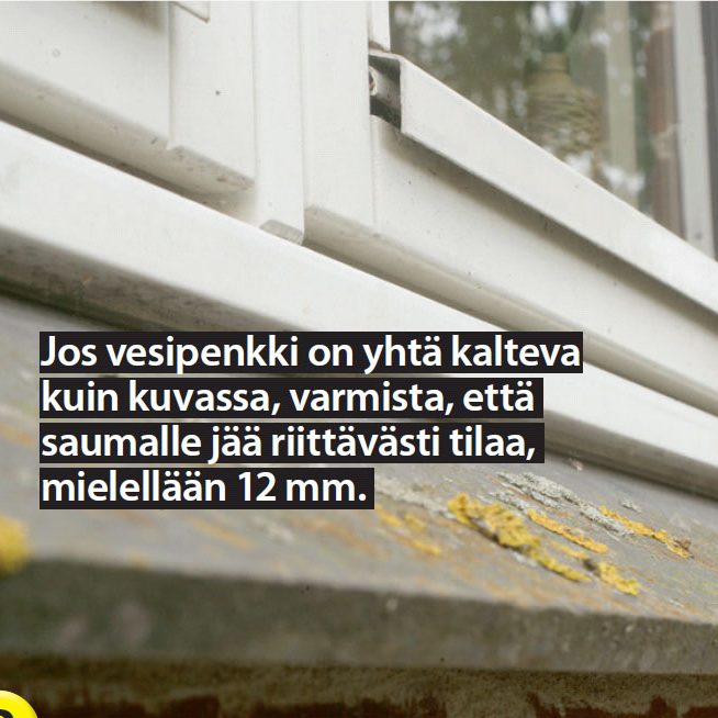 Huomioi vesipenkki. Tämän vanhan ikkunan alla oleva vesipenkki työntyy uraan. Uusi ikkuna sen sijaan vaatii sauman ikkunan ja vesipenkin väliin.