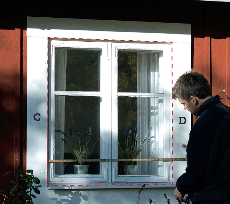 Mittaa ensin ikkunan korkeus ja leveys (ilman peitelautoja; A-B ja C-D). Vähennä luvuista muutama senttimetri, niin saat ikkunaluukut suljettua ja avattua vaivattomammin.