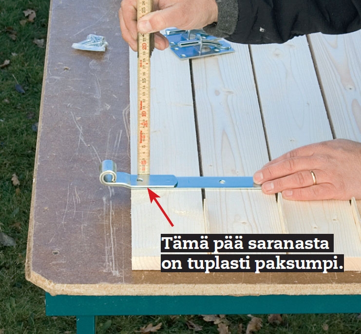 Saranat asennetaan luukun ja listan väliin. Tarkista, että listaan jyrsimäsi ura on riittävän syvä, jotta lista asettuu tiiviisti saranan päälle.