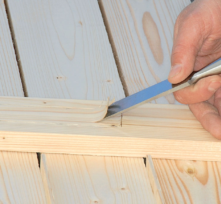Talttaa terävällä taltalla viivojen mukaan. Huomaa, että uran on oltava syvempi siitä päästä listaa, johon saranan tuplapaksu pää tulee. VINKKI: Jos käytössäsi on jyrsin, voit jyrsiä uran sillä.
