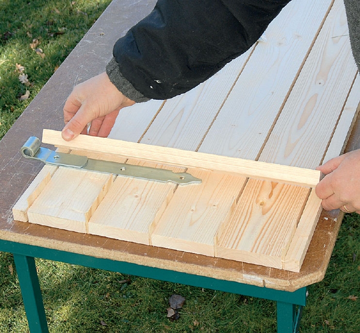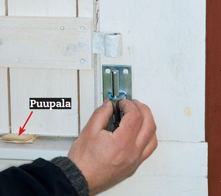 Pidä ikkunaluukkua paikallaan. Voit käyttää pieniä puupaloja tai vastaavia pitääksesi luukun irti ikkuna-laudasta. Aseta saranoiden karmiin kiinni-tettävä osa paikalleen ja ruuvaa se kiinni.