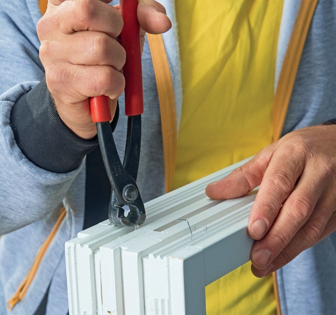 Kun ikkuna-aukko on sovitettu ja kiilattu, asetetaan ikkunan yläreunaan ja pystysivuihin tiivistenauhat ennen ikkunan asennusta. Oikaise ikkuna lopulta julkisivun mukaan ja poraa sitten ikkunakarmin läpi kummallakin sivulla 6 mm poralla ennen kuin kiinni-tät puitteen paikoilleen.