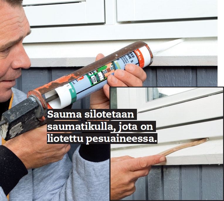 Kun ikkuna on paikoillaan ja eristetty alaosasta, koko ikkunan ympärys viimeistellään kauttaaltaan. Vuorilaudat koostuvat ylävaakalaudasta, joka ulot-tuu 15 mm molempien sivujen pystylau-tojen yli. Alas asetetaan kalteva ikkuna-lauta, joka johtaa pois sadeveden ikku-nan alareunasta ja seinustalta.