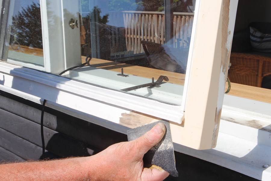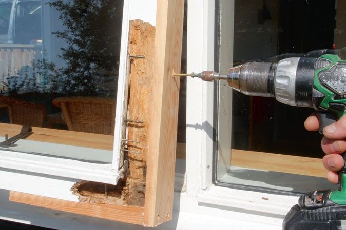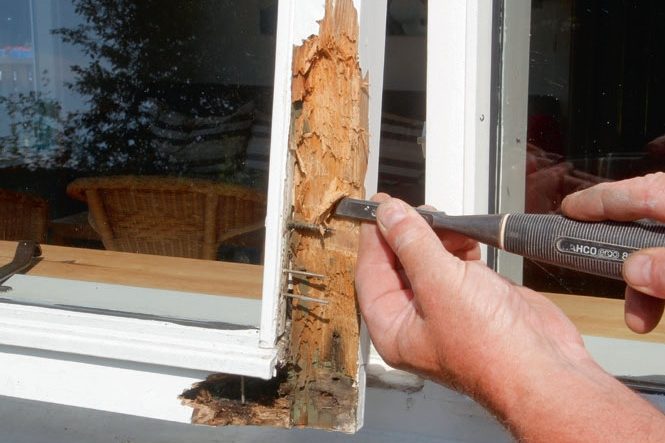 1. Poista ensin kaikki laho puu, jotta korjaus kiinnittyy terveeseen puu hun. Liimapinta saa mielellään olla hieman rosoinen. Voit jättää ruuvit ja lasilistan naulat paikoilleen. Laho ei tartu, ja niin kauan kuin se pysyy kuivana, vaurio ei tästä pahene.