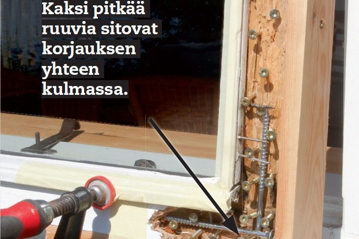 4. Tästä ikkunasta korjataan sekä pysty- että vaakaosia. Paikkauksesta tulee kestävä, kun osien päihin tehdään lapaliitokset.