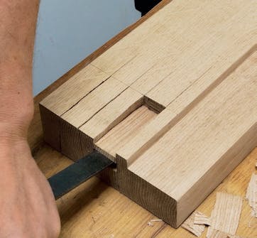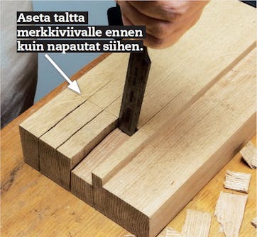 Talttaa tapit ulos. Kun tapit on sahattu kahdelta sivulta, aukko taltataan auki. Iske taltta pystysuoraan parilla vahvalla ja tarkasti merkkiviivaan osuvalla iskulla. Käännä taltan terän sileä puoli viivaa kohti.
