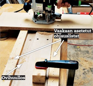Jyrsi liitospinnat puhtaiksi ja täysin suorakulmaisiksi ohjaimen avulla. Aseta jyrsin lankun puoleen paksuuteen. Jyrsi liitos puhtaaksi, tai jyrsi urat, ja talttaa puuaines irti. Urat voi tehdä myös pyörö-sahalla, jolloin jyrsintää ei tarvita.