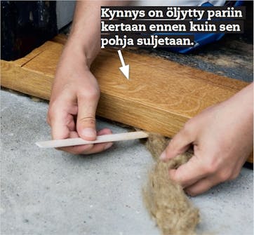 Kokeile, sopivatko kynnyksen ja karmin tapit toisiinsa. Tappien on liu’uttava loviin napauttamalla varovasti kynnyskappaleen päätyyn. OIkaise kynnyk-sen lovia, jos tarpeen. Sivele karmitappeihin pohjustusöljyä ennen kuin liität kappaleet.