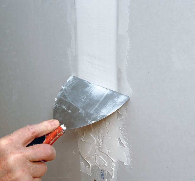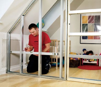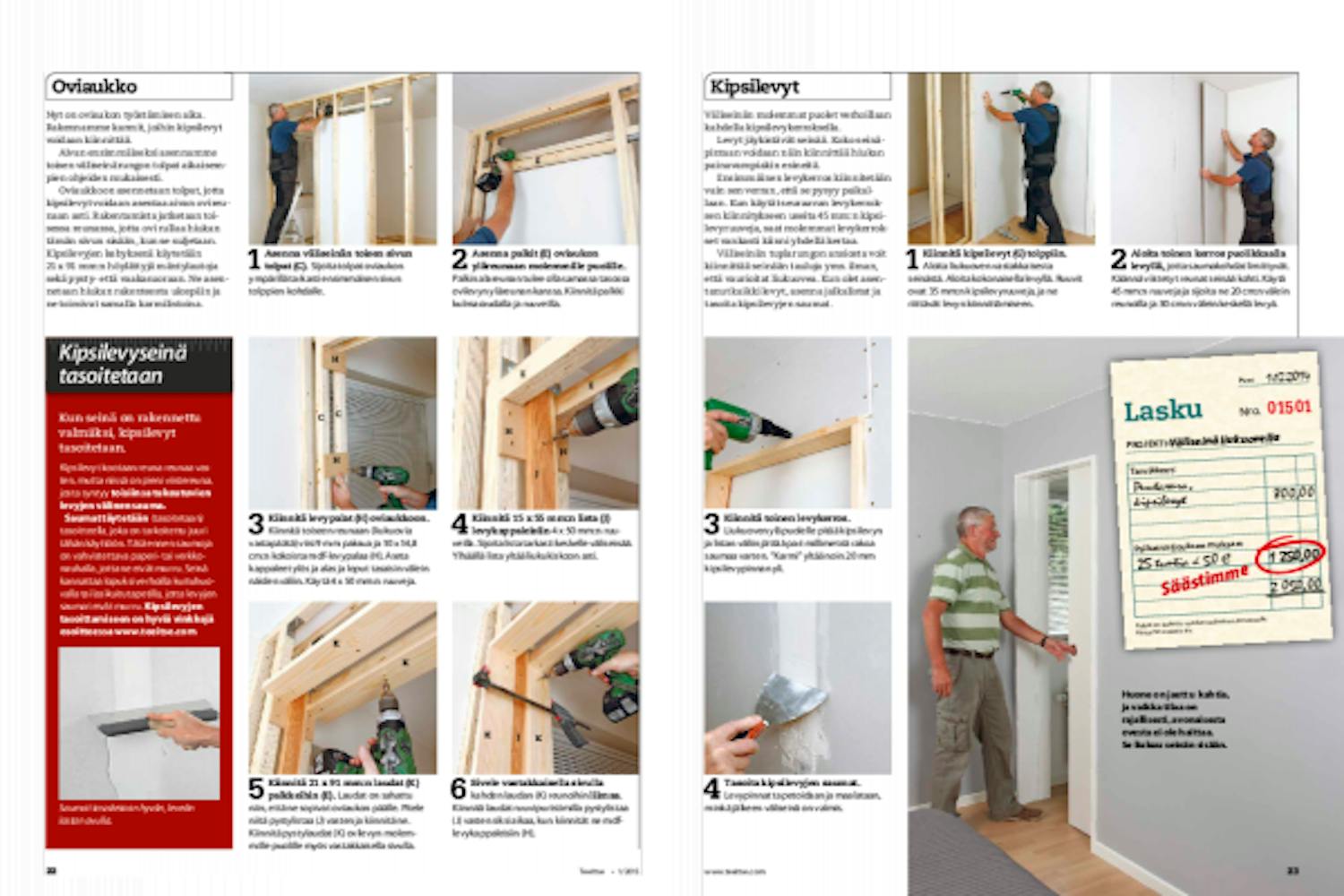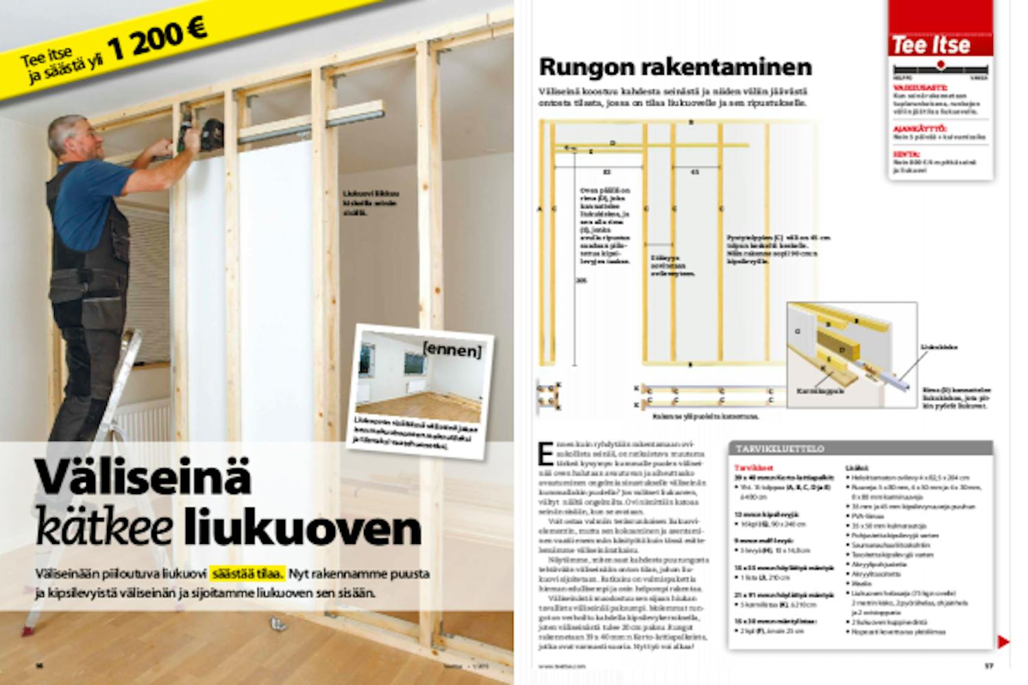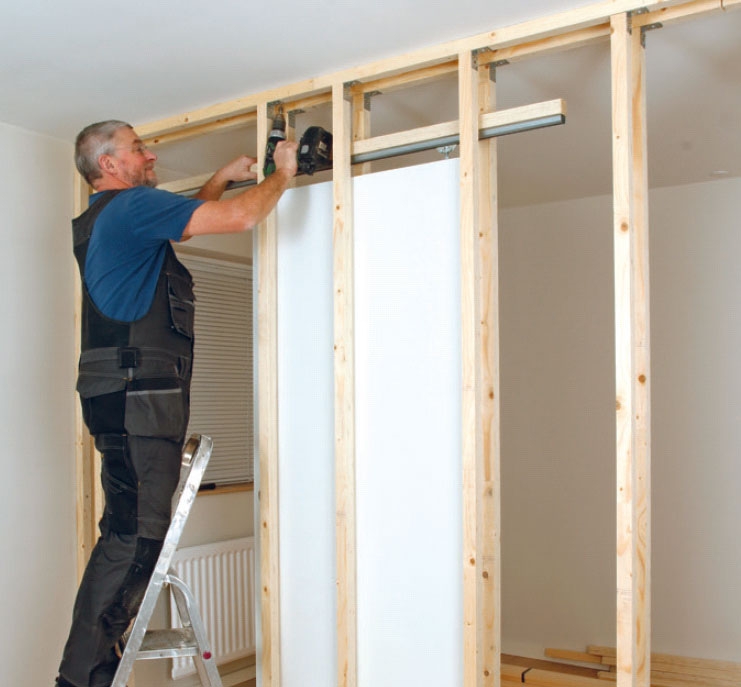 Väliseinän tuplarungon ansiosta voit kiinnittää seinään tauluja yms. ilman, että vaurioitat liukuovea. Kun olet asen-tanut kaikki levyt, asenna jalkalistat ja tasoita kipsilevyjen saumat.
