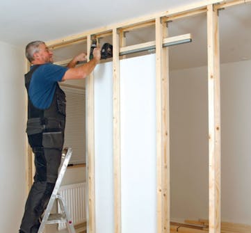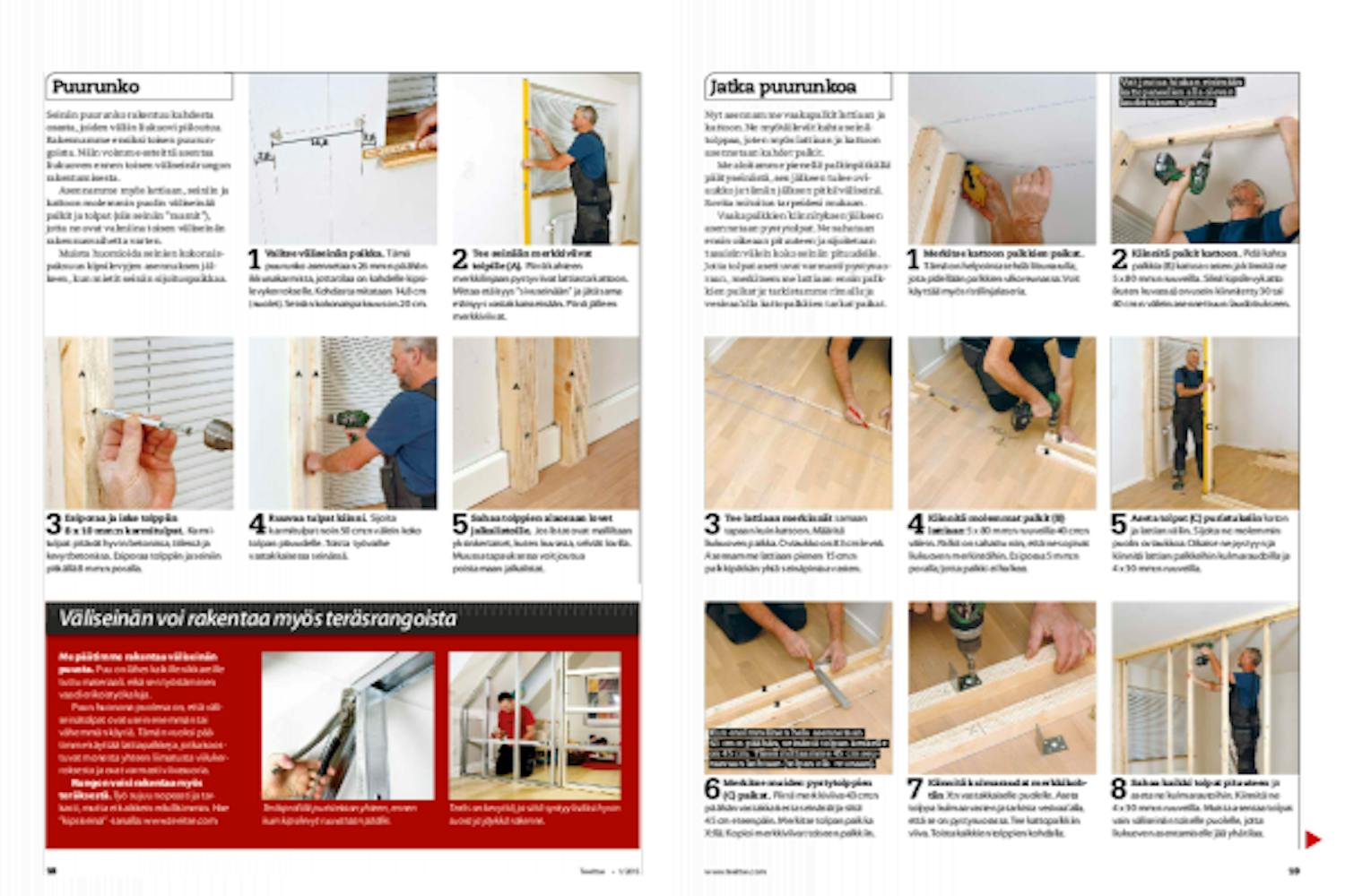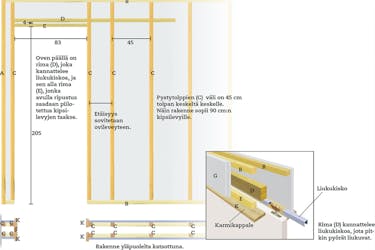 Seinän puurunko rakentuu kahdesta osasta, joiden väliin liukuovi piiloutuu. Rakennamme ensiksi toisen puurun-goista. Näin voimme esteittä asentaa liukuoven ennen toisen väliseinärungon rakentamisesta.