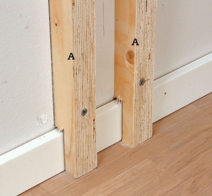 Tee seinään merkkiviivat tolpille (A). Piirrä kahteen merkkilinjaan pystyviivat lattiasta kattoon. Mittaa etäi syys ”sivuseinään” ja jätä sama etäisyys vastakkaisseinään. Piirrä jälleen merkkiviivat.