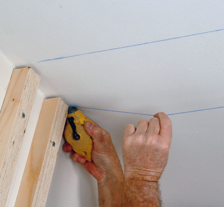 Merkitse kattoon palkkien paikat. Tämä on helpointa tehdä liitunarulla, jota pidellään palkkien ulkoreunassa. Voit käyttää myös ristilinjalaseria.