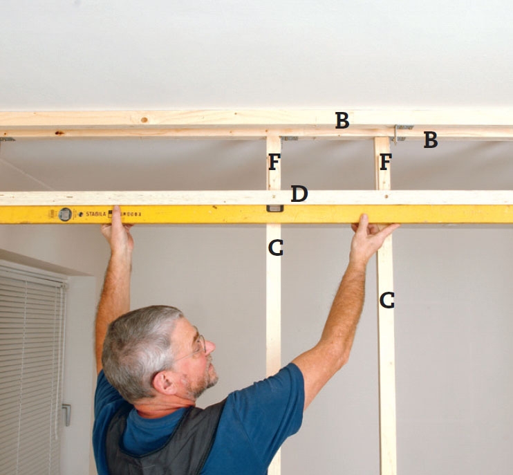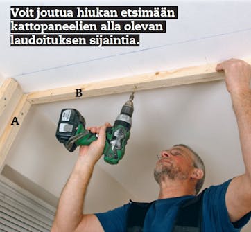 Kiinnitä palkit kattoon. Pidä kahta palkkia (B) kattoa vasten ja kiinnitä ne 5 x 80 mm:n ruuveilla. Sileä kipsilevykatto (kuten kuvassa) on usein kiinnitetty 30 tai 40 cm:n välein asennettuun laudoitukseen.