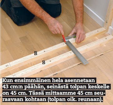Merkitse muiden pystytolppien (C) paikat. Piirrä merkkiviiva 43 cm:n päähän vastakkaisesta seinästä ja siitä 45 cm eteenpäin. Merkitse tolpan paikka X:llä. Kopioi merkkiviivat toiseen palkkiin.